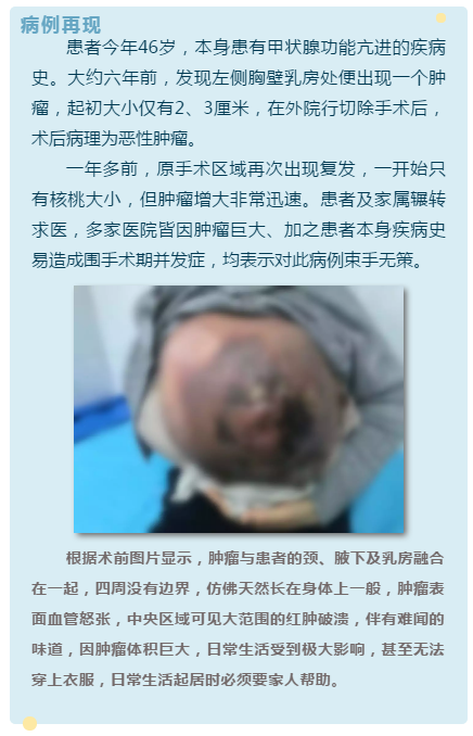 如此巨大的胸壁肿瘤在临床中非常少见,经科室集体讨论后,决定联合乳腺肿瘤一科、病理科、输血科、介入治疗科、放射科、感染科、手术室、重症监护科等科室专家,为患者进行多学科会诊,制定个性化诊疗方案。