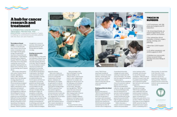 多年来,天津医科大学肿瘤医院不断提升科研实力,加快交流与合作步伐,影响力进一步扩大,吸引国际视野关注。国际顶尖科学杂志NATURE在2020年4月23日出版的Nature Index on Cancer中,刊发了医院专题报道,内容涵盖医院发展现状、优势特色学科、人才团队储备、科研平台建设、国际交流合作、未来发展方向等,并重点介绍了医院在肿瘤预防模式建立、发生发展机制探索,诊断和治疗新技术研发以及多中心临床研究开展方面取得的重要进展。