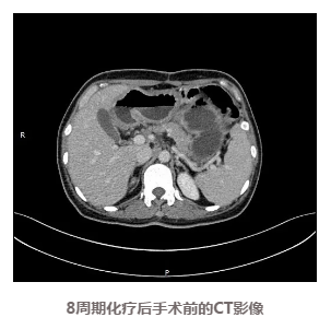 手术解决了梗阻问题,李女士的进食情况明显改善,逐步进流食、半流食、软食,直到可以少量多次进行基本正常饮食,体力状态和体重也逐渐恢复,根据方案进行了双药联合化疗,期间耐受性良好,复查CT显示肿瘤逐渐缩小。