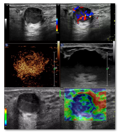 超声检查操作简便易行、且无辐射损害,可以短期多次反复进行,适用于任何年龄和女性任何生理时期(包括妊娠期和哺乳期)。随着科技的发展与进步,超声检查不仅可实时观察病灶二维灰阶超声特征,还具有彩色多普勒血流成像、弹性成像、超声造影等多种新技术,为诊断提供更多依据。