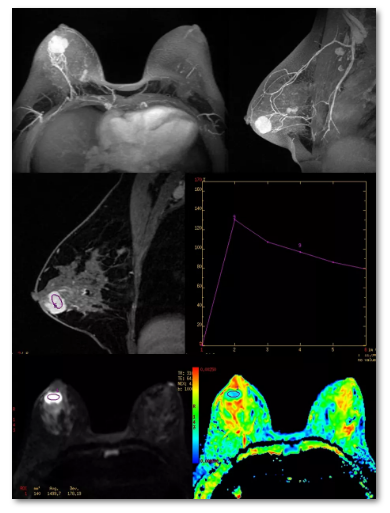 ·对多中心、多灶性病变的检出较为敏感,对胸壁侵犯的观察以及对腋窝、内乳区的显示较为敏感,可为乳腺癌的准确分期和临床制订治疗方案提供可靠的依据;