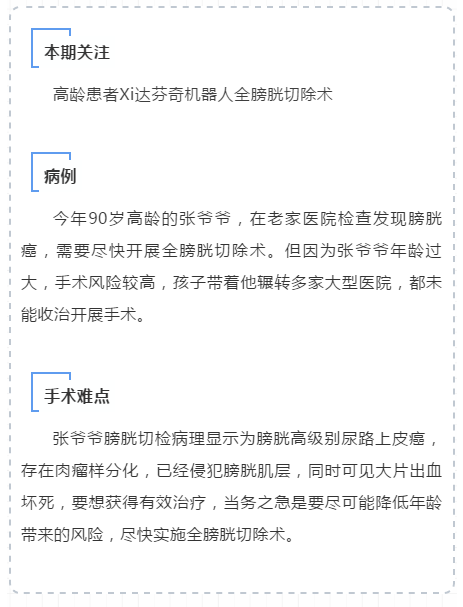 近日,我院泌尿肿瘤科科主任姚欣教授带领外科手术团队成功为一例90岁高龄男性患者实施Xi达芬奇机器人全膀胱切除术。