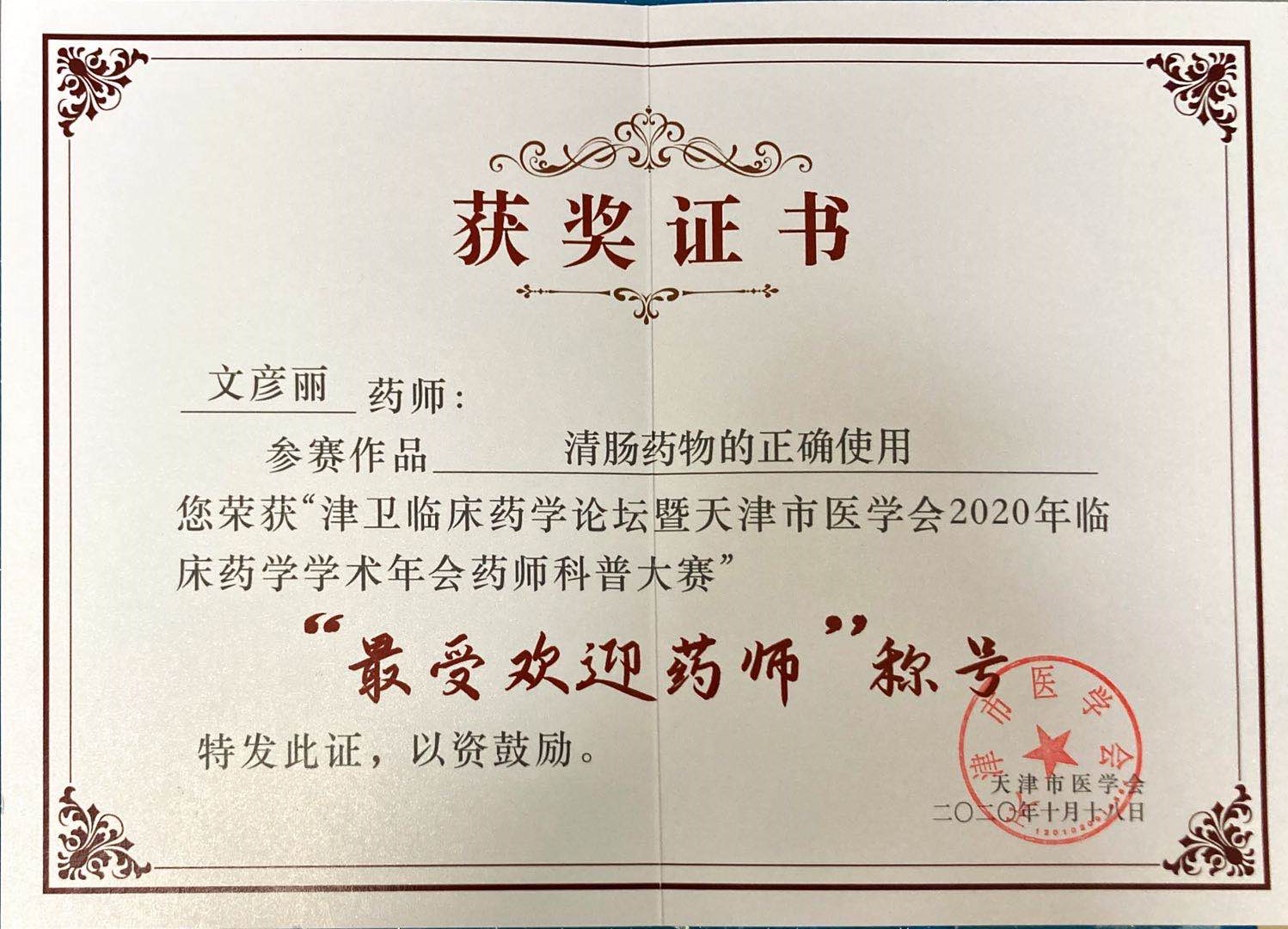 为落实《“健康中国2030”规划纲要》的方针策略,推进健康中国建设,加强互联网医疗健康科普知识创作与传播的规范化、标准化,鼓励药师以新媒体方式参与全民健康教育,让药师走入大众视野,普及安全用药知识,由天津市医学会与北京医学奖励基金会共同主办,天津市医学会临床药学分会承办的“津卫临床药学论坛暨天津市医学会2020年临床药学学术年会”于2020年10月18日召开,并在同期举办了药师科普演讲大赛。经专家评委打分选拔,药学部文彦丽药师在初赛中脱颖而出,并在决赛中荣获本次科普演讲比赛三等奖和“最受欢迎药师”荣誉称号。