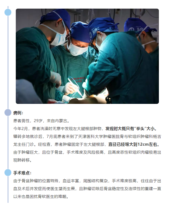 2020年11月18日,在邢汝维主任、杨蕴主任及滕胜主任的指导下,杨吉龙主任与赵军主任带领手术团队历时5个半小时,出血约1900毫升,顺利、精准、圆满完成半骨盆切除及重建。