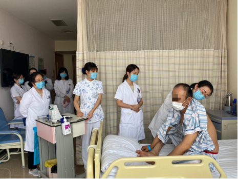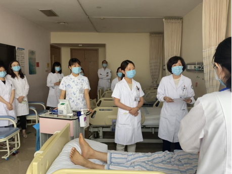 随后,刘文婷同学在床旁脱稿汇报了大病历,住院医师孟昭婷对病史的不完整部分进行了补充。之后,刘文婷同学对患者进行了视、触、扣、听的胸部专科查体。刘东颖主任针对学生的床旁查体给予了纠正并进行规范的示教,引导学生掌握汇报病史的要领、补充诊疗思维的不足,并提示查体时要注意体现对患者的人文关怀。