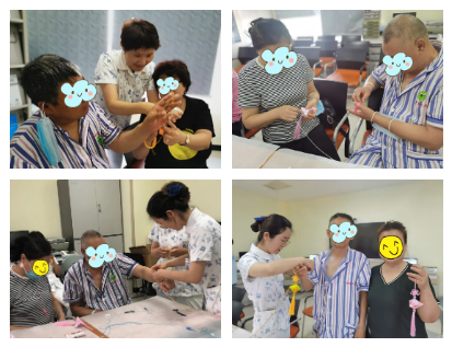 佳节情长,源自心间的美好相聚。放松训练结束后,医护人员组织大家一起进行了“你缠线,我裹粽”的护患互动活动,一起亲手制作粽子型挂坠,五彩的粽子代表着安康与幸福,为平淡而又紧张的住院生活增添了一份温馨和乐趣。随后护士们将饱含了医护人员关心和祝福的五彩手绳,系于患者和家属的手腕,鼓励大家凝结成一股力量,携手战胜病魔。