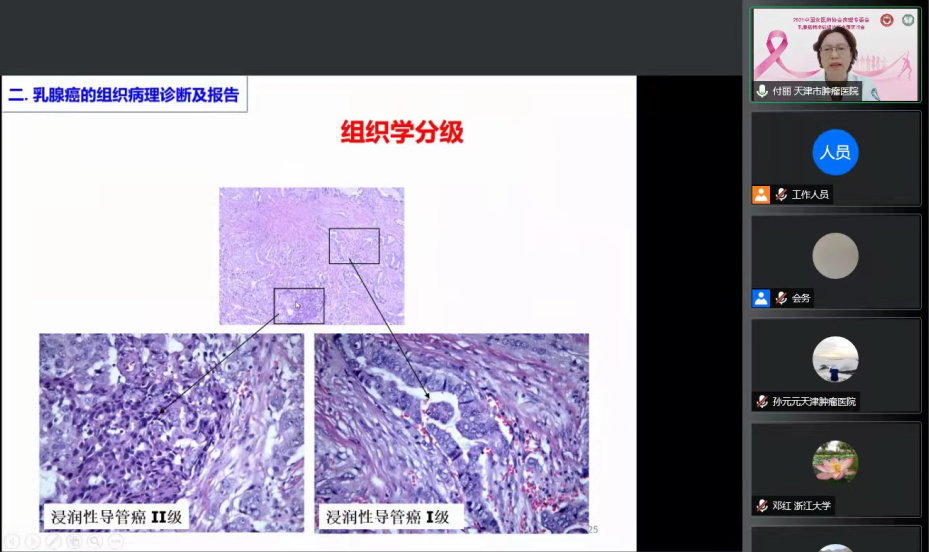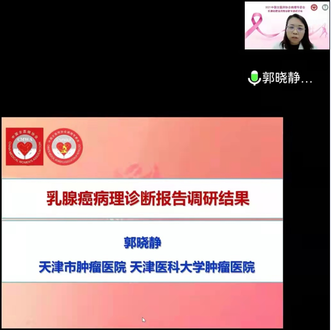 中国女医师协会病理专业委员会,在协会的鼎力支持下,申请获得了“我国三级甲等医院乳腺癌病理诊断现况调研”的国家继续教育项目并获得批准。项目调研过程中,共获得10余家单位病理科提交的乳腺癌(包括根治术标本、保乳手术标本、穿刺标本和冰冻标本)病理诊断报告200余份。专委会就各单位各类乳腺癌标本病理诊断报告的内容、形式进行了阅读评估和总结。为了更广泛深入地交流,在付丽主委的主持领导下,于2021年12月14日举办了线上专题研讨会。