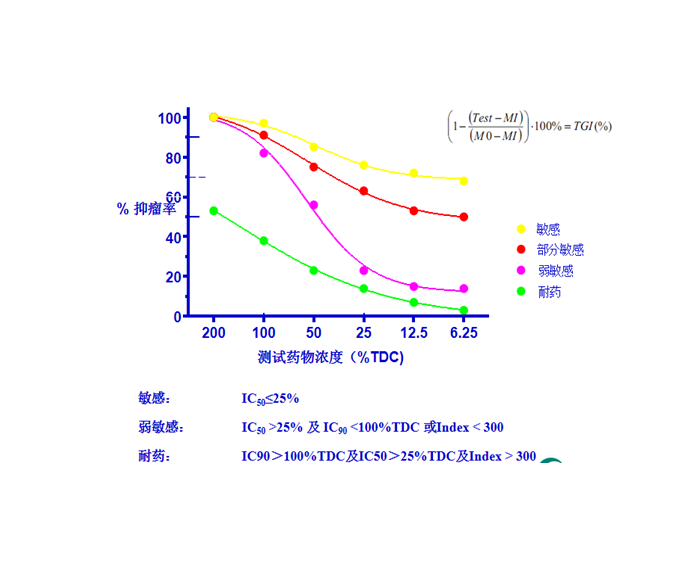 通过体外共培养来自肿瘤患者的原代肿瘤细胞和候选的临床化疗药物,检测共培养后残存的肿瘤细胞ATP 来计算肿瘤细胞的生存率,得出各筛选药物浓度梯度--肿瘤细胞生长抑制曲线,据此计算评估出在体外此患者肿瘤细胞对各药物的敏感和耐药性,筛选出耐药药物,以避免使用耐药药物。