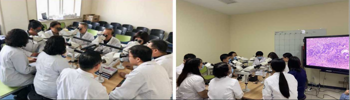 教学制度完善。基地围绕住院医师规范化的全过程管理,制定了一套系统且实用的特色培训计划。课程设置涵盖理论知识、实践操作及沟通技巧等方面。所有带教老师配备双人或三人共览显微镜,日常教学采取“一对一” 及轮转制。“一对一”模式可在镜下实时指导,及时解答住院医师疑问,效果良好。导师为住院医师提供个性化指导,切实履行培养责任,为提升教学质量、培养优秀临床病理医师奠定基础。基地每周安排小讲课、疑难病理读片讨论,定期开展病理诊断系列讲座,安排学员参与取材初诊排班,并为学员开展临床病理研究提供条件。