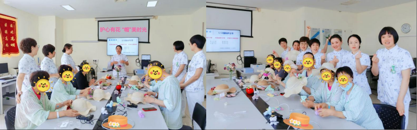 介入术后初愈的王阿姨(化名)与护士杨志敏共同将彩色镭射纸剪成蝴蝶形状并制作成草帽,起名为“蝶变之舞”,表达了对康复的信心。王阿姨说,蝴蝶“停”在她头顶,寓意是她将“破茧重生”;即将出院的李叔叔(化名)在活动中悄悄地告诉护士李荔:“其实,这顶帽子是我给爱人制作的,她陪我看病太辛苦了,我非常感谢她,可又羞于表达......”护士们得知后,悄悄地请他的爱人来到叔叔身边,帮助李叔叔一起送出了他对老伴的感激与祝福。